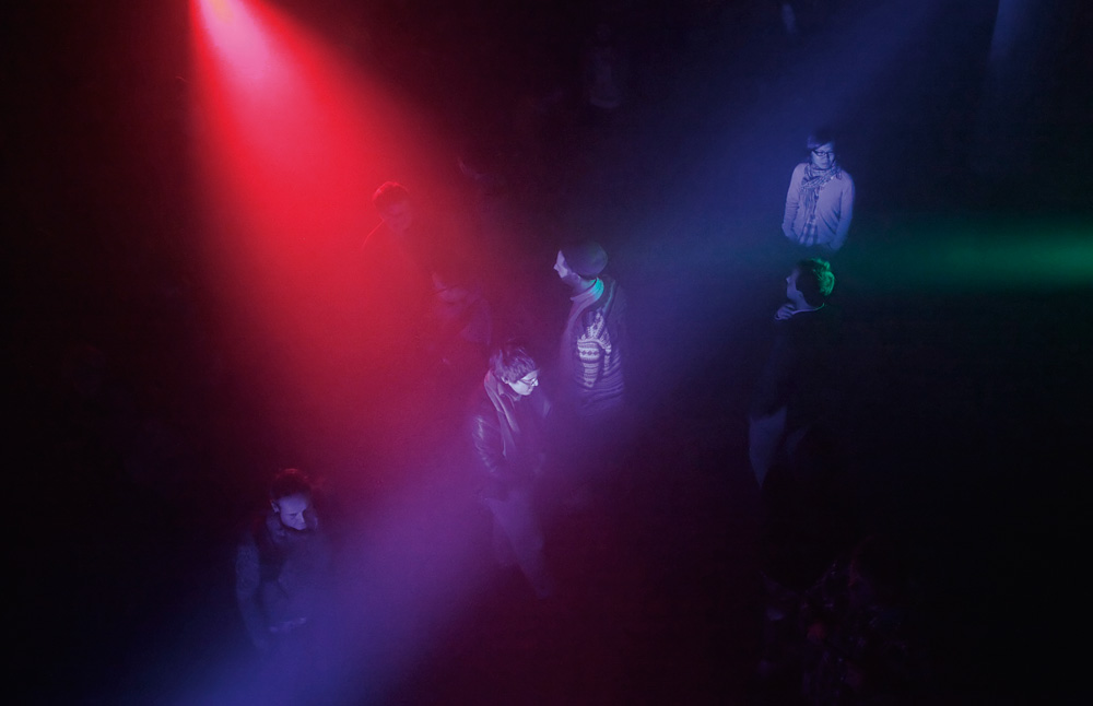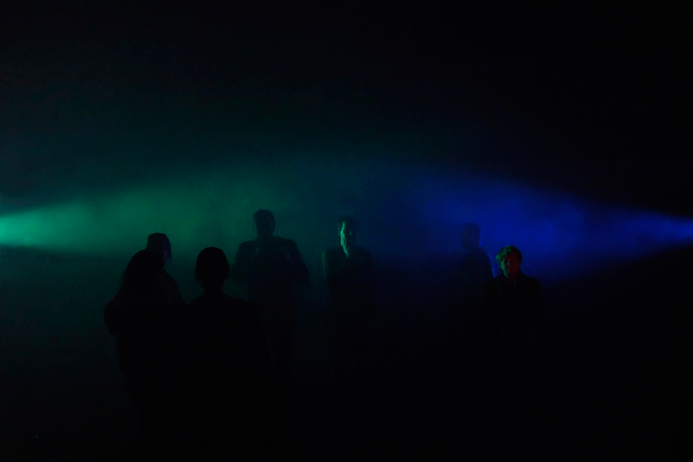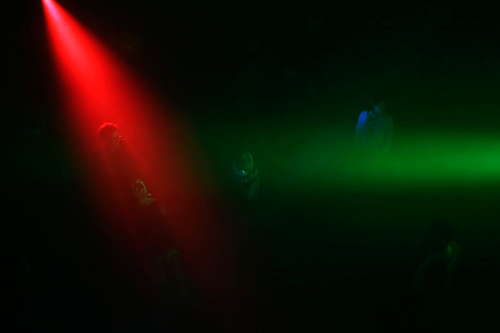 RGB consists of three sets of apparatuses comprise a moving light and a directional speaker controlled by a computer algorithm. Each apparatus throws beam of colored light (Red, Green, Blue) and a tone that constantly moves direction into a space where all the three colors and tones synthesize into a space of shifting colors and tones. The visitors can move around in the space and situate themselves in their unique zones. That zone does not remain still, but continuously morphs according to the visitor’s small movements, the other visitors’ movements and the behaviors of the apparatuses.