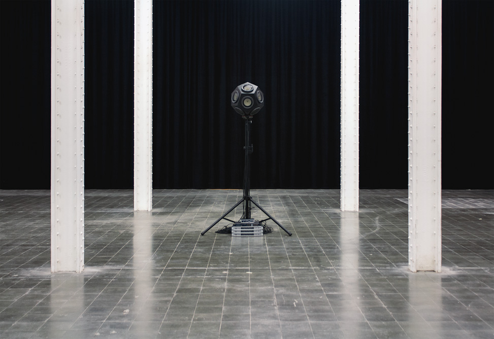 The installation, Atmosphere, creates a differentiated field of sound. The speakers beam slightly different frequencies into the air. The sounds gradually modulate each other and create gradients in the middle of the air. The spectator explorers the space of intensive differences by their own movements.