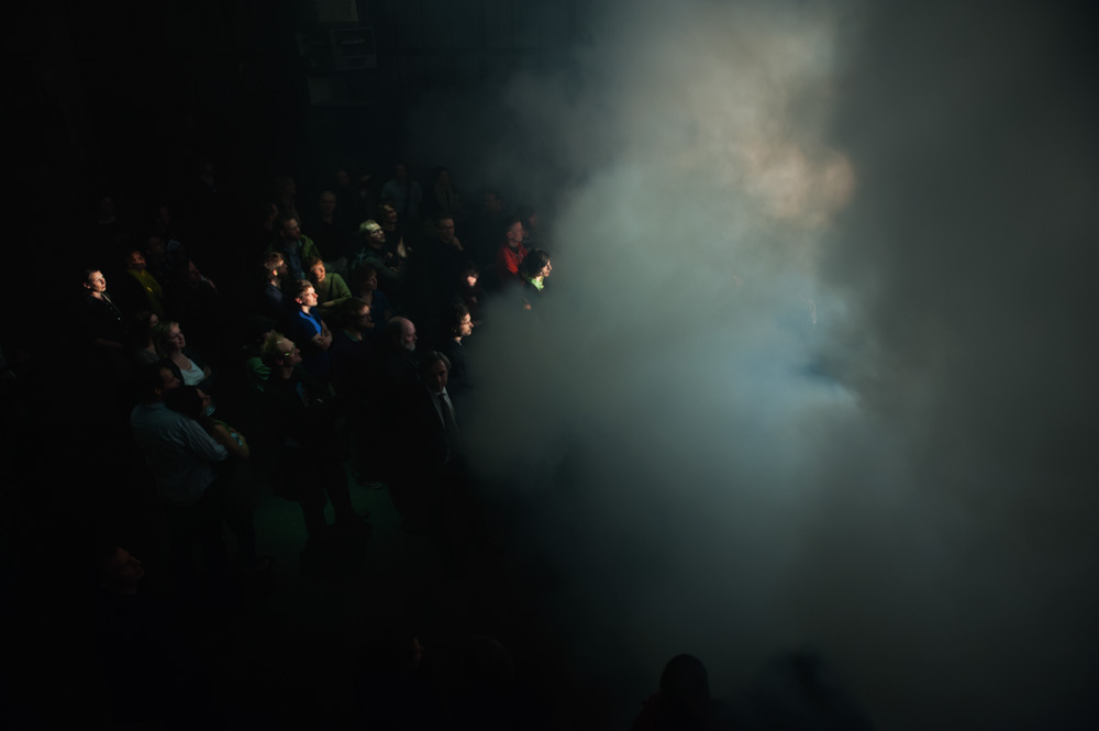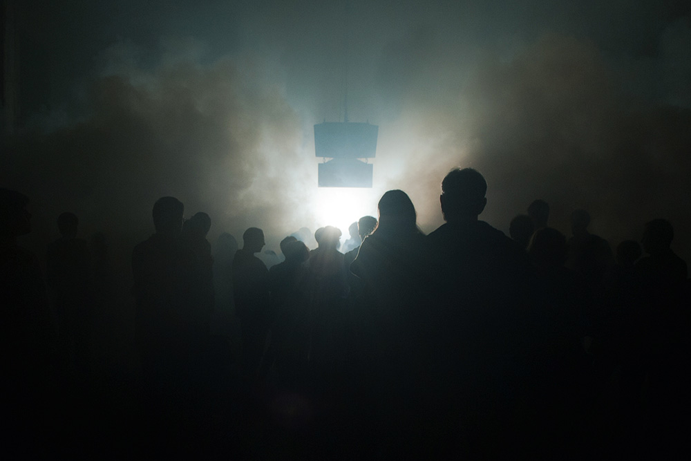 Conflux is part of a series of the works that explicitly tackle the phenomenon of perception and is based on concepts that he developed from his current research on dynamic systems, phenomenology and experimental psychology. Conflux was informed by James J. Gibson’s Theory of ecological perception, which focuses on the perceiver’s interaction with particular properties of their environment. It creates a visually and acoustically artificial environment, which makes for a unique experience in which shifting modes of perception are made tangible – from the perception of the surroundings to the proprioception of the perceivers themselves. The perceivers are active parts of the performative installation.