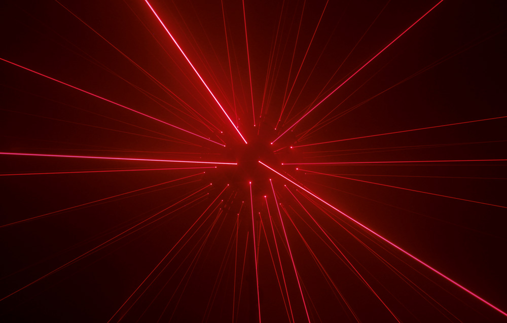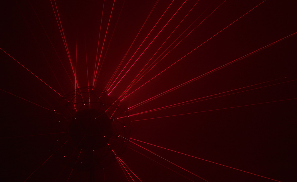 There are 92 custom laser units with microphones on the aluminum geodesic shell. The sound from the dodecahedron speaker is synthesized by chaos functions, which dynamically shift between stasis and dynamics. By using the microphones as sensor inputs, the sound pressure level of the dodecahedron speaker controls the intensity of the lasers. With complex phase interferences around the speaker, the laser rays produce another layer of patterns. This environment consists of multiple layers of interfered strata of light and sound.