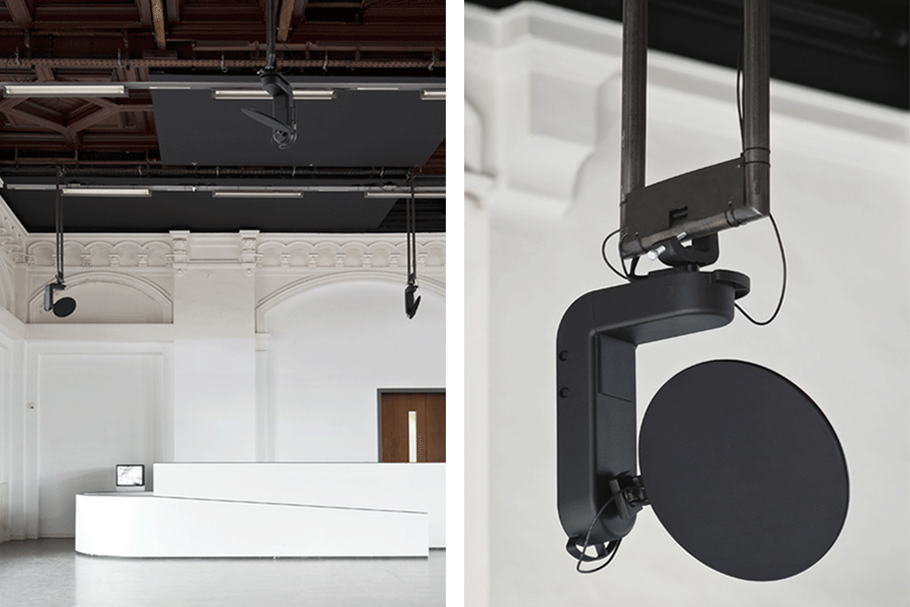 Waveguide consists of three objects with directional speakers and moving arms. Each directional speaker throws a beam of white noise. As visitors move about in a space, they are caught in an acoustic cross-fire produced by three directional speakers mounted in the ceiling of the room. As these directional speakers attached to the moving arms continually fire off white noise, they appear to rotate, changing positions. The produced sounds bounce off the surfaces of the space, creating an ever-changing maze of reflections; an acoustic swell of spatial gradients as the listeners wander between ever shifting collimated beams of sounds.